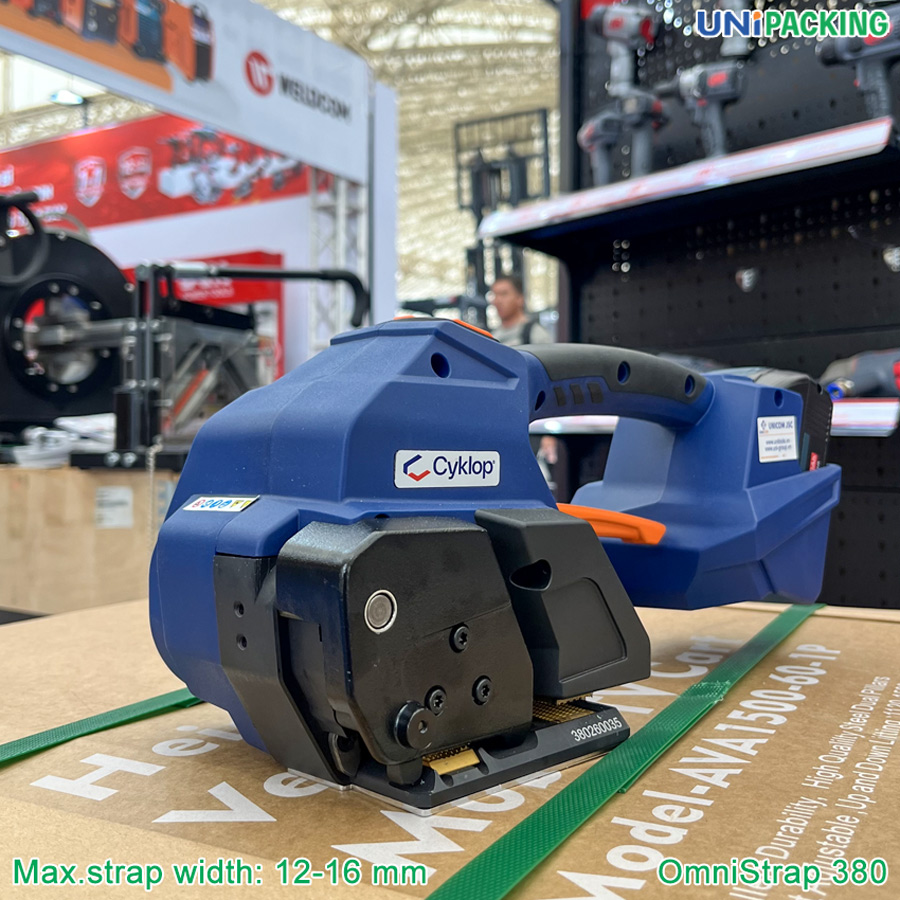 Máy đóng dây đai nhựa 12-16 mm dùng pin, loại cầm tay model Omnistrap 380 Cyklop Germany – Ứng dụng để đóng đai cố định các kiện hàng Pallet hay các thùng carton cỡ lớn. Lực siết đai lên tới 4500N đảm bảo hàng hóa chắc chắn. Sản xuất bởi hãng Cyklop Germany